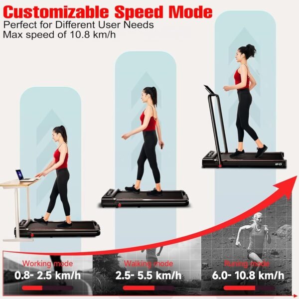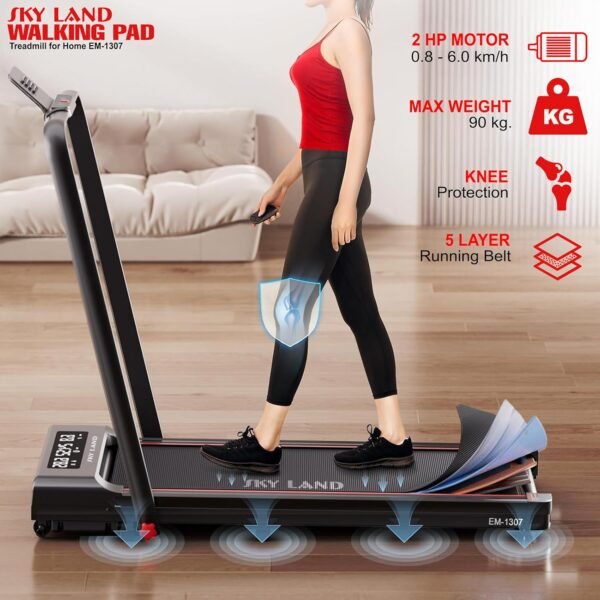The SKY LAND Walking Pad Treadmill delivers smooth and quiet performance with a durable 2 HP motor, making it ideal for home and office workouts. With speed options ranging from 0.8 to 10.8 km/h, it supports both walking and light jogging through its dual speed modes.